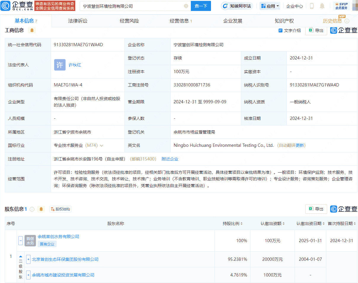 宁波慧创环境检测公司成立,首创环保间接控股布局新领域