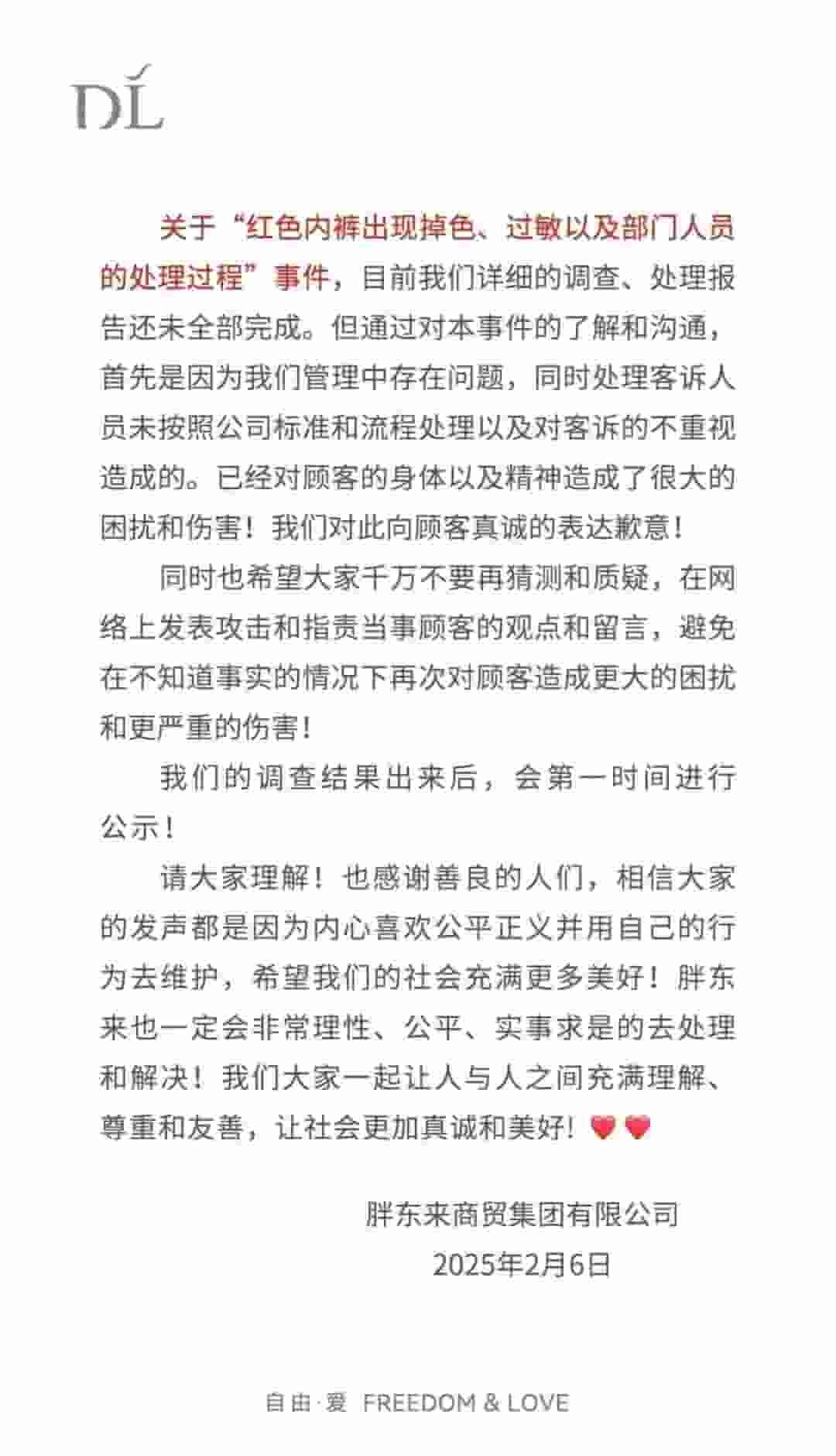 近日,三言科技报道了一则关于胖东来的消费者投诉事件。据网友反映,其在胖东来购买的红色内裤出现了掉色和导致过敏的情况。对此,胖东来再次发表声明,向受影响的顾客致以诚挚的歉意。