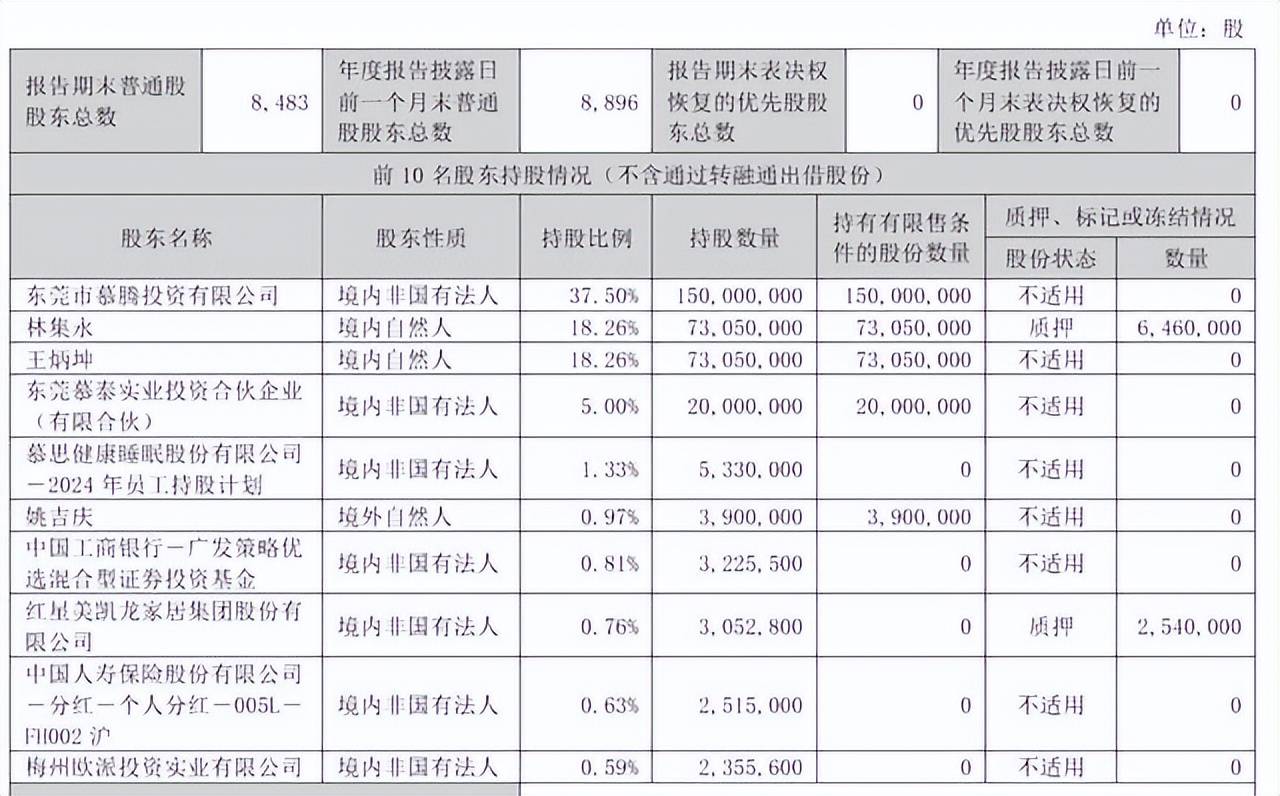 整体来看,王炳坤和林集永合计控制了慕思股份约79%的股权,显示出他们对公司的强大控制力。与此相比,其他股东的持股比例则相对较低。