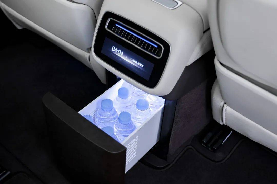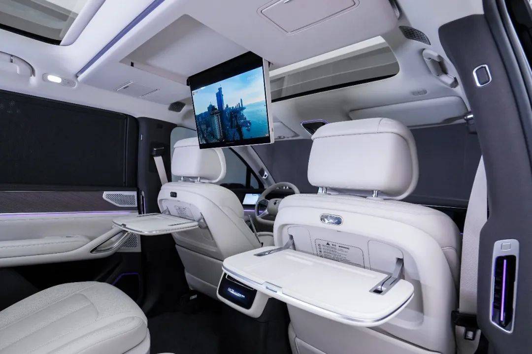 为了满足不同场景下的需求,腾势N9的车内座椅设计颇具匠心。一二排可以形成大床模式,二三排同样可以组合成大床,配合后排小桌板、车内冰箱以及后排娱乐屏等配置,无论是车内办公、休息还是娱乐观影,都能轻松应对。