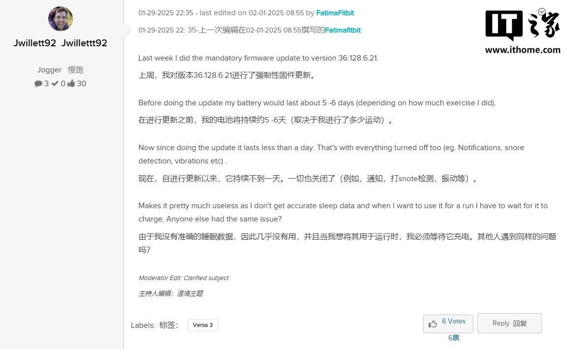 不少用户在Fitbit社区论坛和Reddit上纷纷表达了他们的失望和不满。一位用户提到,在更新固件之前,他的手表电池能够持续使用5到6天,但更新后即使关闭了所有附加功能,电池也无法支撑一整天。另一位用户也表示,他的手表电池续航从原本的一周缩短到了不足一天。