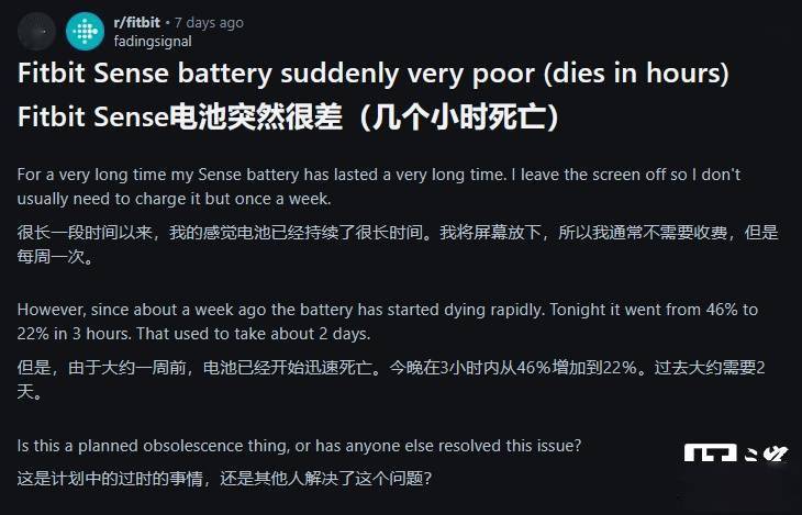 在Reddit上,类似的抱怨同样不绝于耳。有用户指出,他的Sense手表原本电池续航很长,通常一周只需充电一次,但最近一周电池消耗速度明显加快。甚至有用户在短短3小时内,手表电量从46%降到了22%,而在过去这通常需要两天时间。