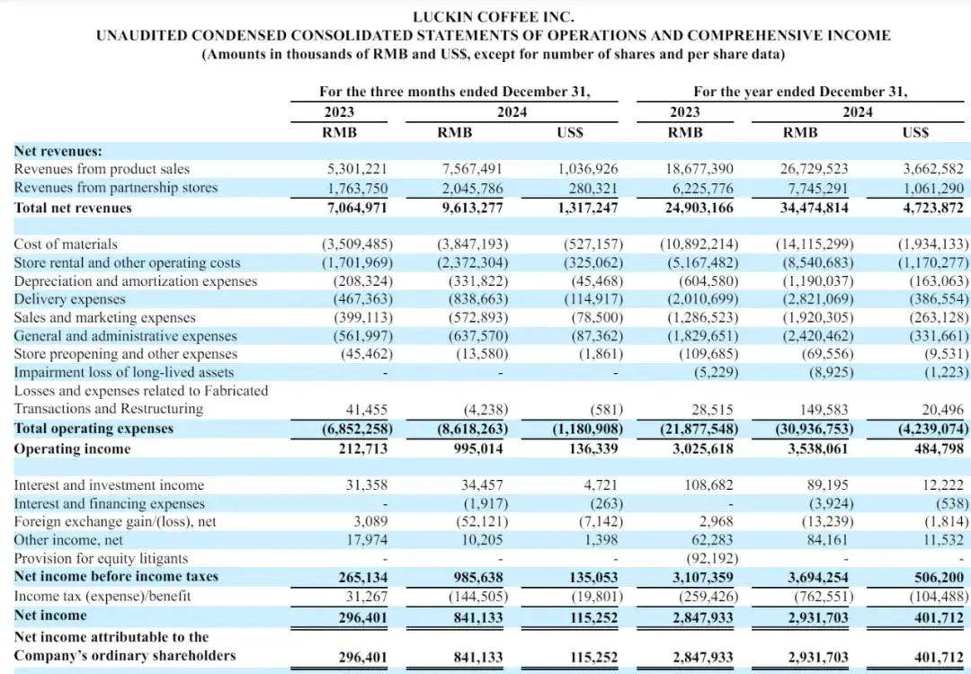 瑞幸咖啡2024年财报亮眼:门店数破2万,营收增长近四成