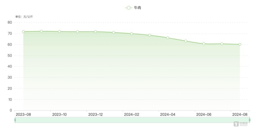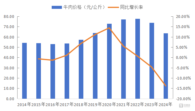 根据国家统计局的数据显示,从2014年至2022年,牛肉价格经历了大幅上涨,从每公斤61.39元攀升至85.8元,涨幅接近40%。然而,自2023年下半年开始,牛肉批发价格却出现了显著下滑,至2024年下半年已接近60元/公斤,成为近五年来的最低价区间。