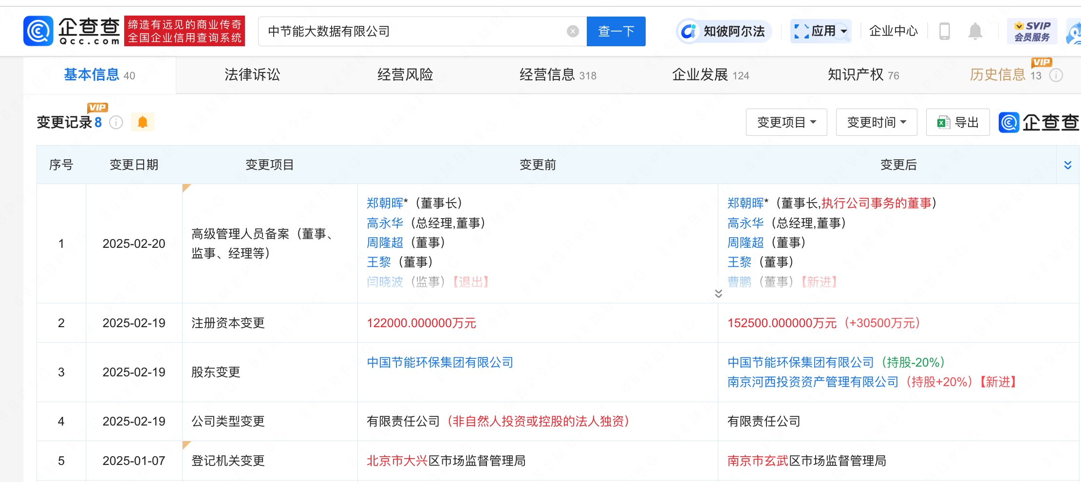 企查查APP显示,近日,中节能大数据有限公司发生工商变更,新增南京河西投资资产管理有限公司为股东,同时注册资本由12.2亿人民币增至15.25亿人民币,增幅25%。