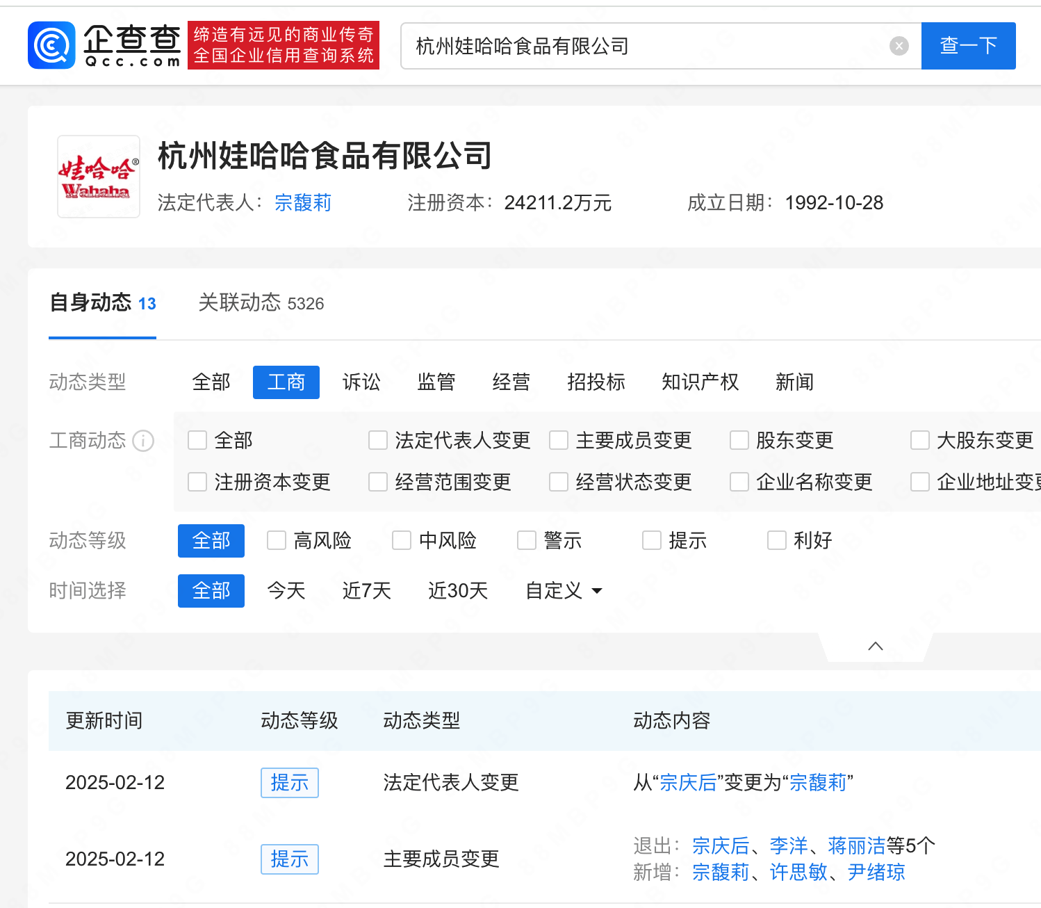 此前,杭州娃哈哈食品有限公司发生工商变更,宗庆后卸任法定代表人、董事长,由宗馥莉接任法定代表人并担任董事、经理。
