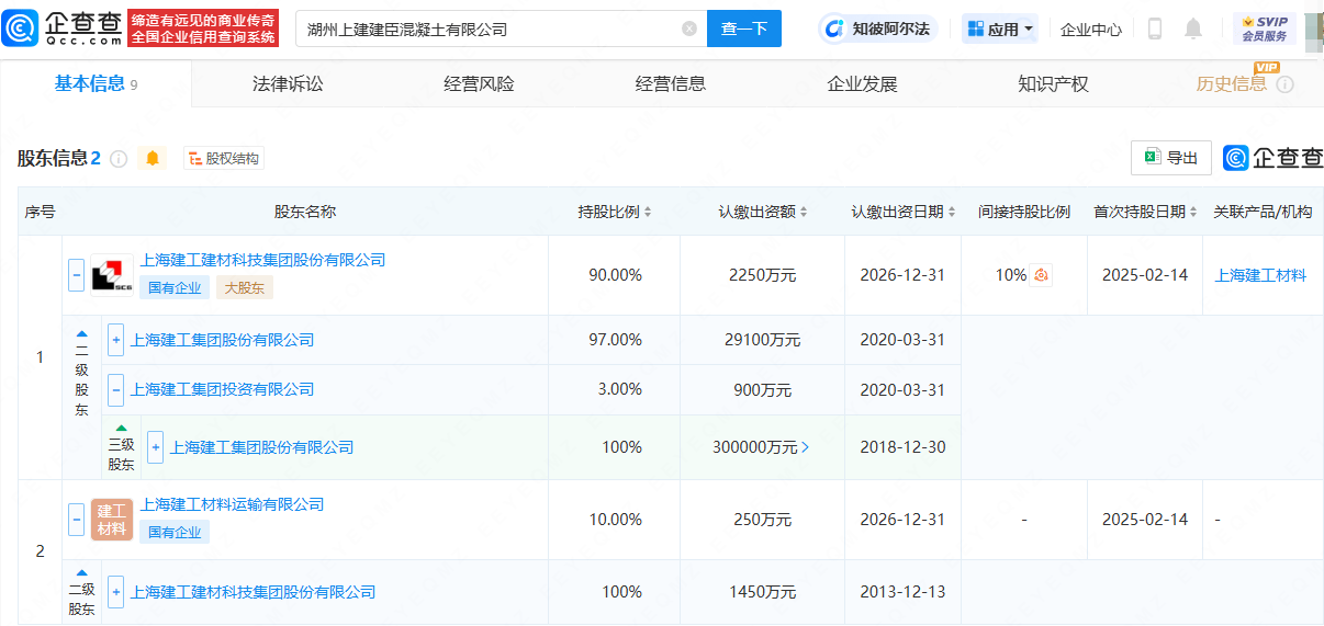 根据企查查APP的详细股权穿透信息显示,湖州上建建臣混凝土有限公司的背后,存在着上海建工(股票代码:600170)的间接全资控股身影。这一发现无疑揭示了该公司在行业内的深厚背景和实力支撑。