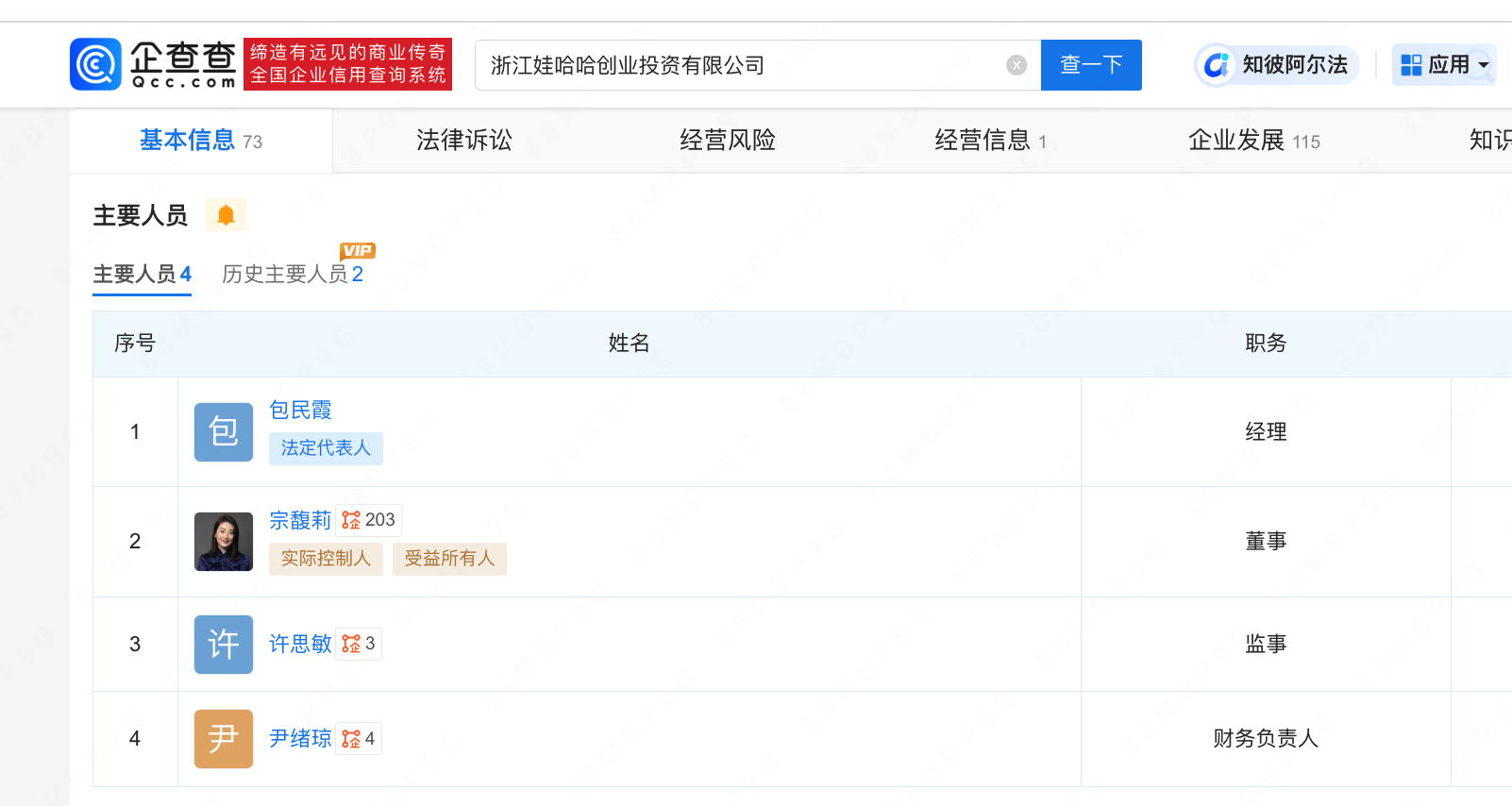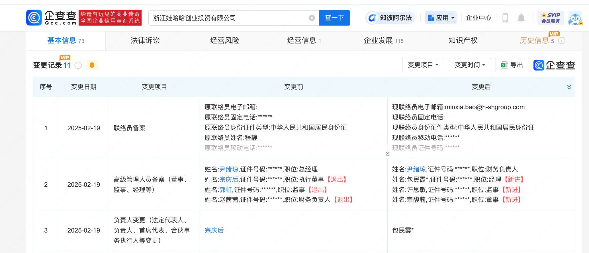 近期,浙江娃哈哈创业投资有限公司迎来了一系列高层人事调整。据企查查APP披露,该公司法定代表人及执行董事一职已发生变动,宗庆后不再担任相关职务,这一角色现由包民霞接掌,同时她还兼任了经理一职。与此同时,宗馥莉则出任公司董事,公司其他多位关键岗位人员亦有相应变动。
