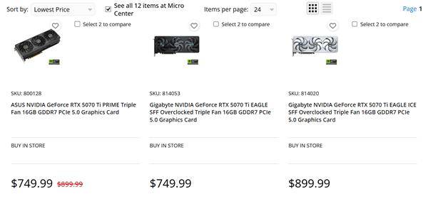 在其他销售平台上,RTX 5070 Ti显卡的供应情况也大同小异,国外市场同样面临类似的困境。在美国新蛋网站上,虽然乍一看原价749美元的显卡选项似乎不少,涵盖华硕、技嘉、微星等多个品牌,但实际上这些原价选项也只是少数,更多产品售价远高于此。