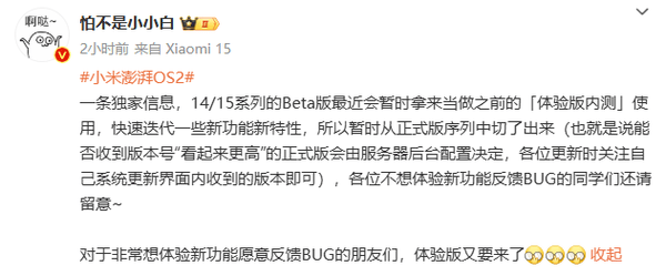 小米14/15系列Beta版来袭,澎湃OS新功能快速迭代体验中