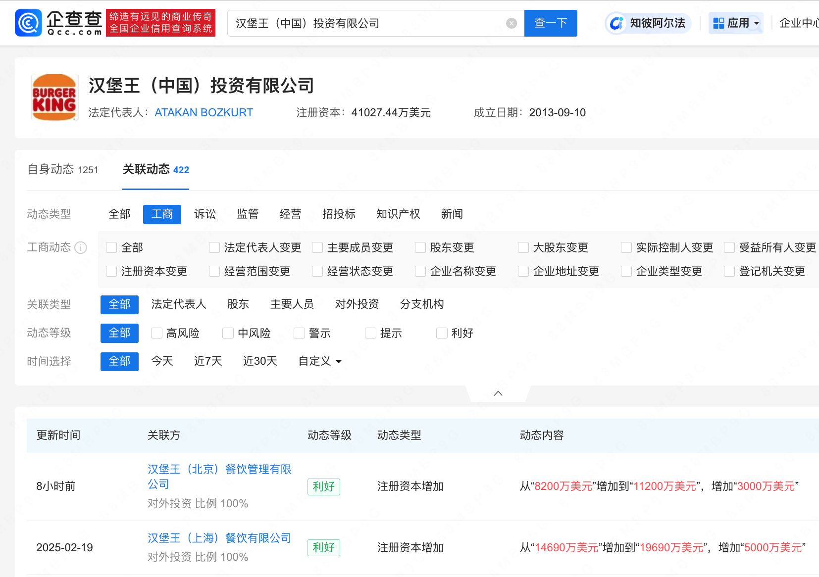 此前,汉堡王(中国)投资有限公司及其旗下的汉堡王(上海)餐饮有限公司均发生了工商变更,其中,汉堡王(中国)投资有限公司的注册资本由约3.1亿美元增加至约4.1亿美元,而汉堡王(上海)餐饮有限公司的注册资本则由约1.47亿美元增至约1.97亿美元。