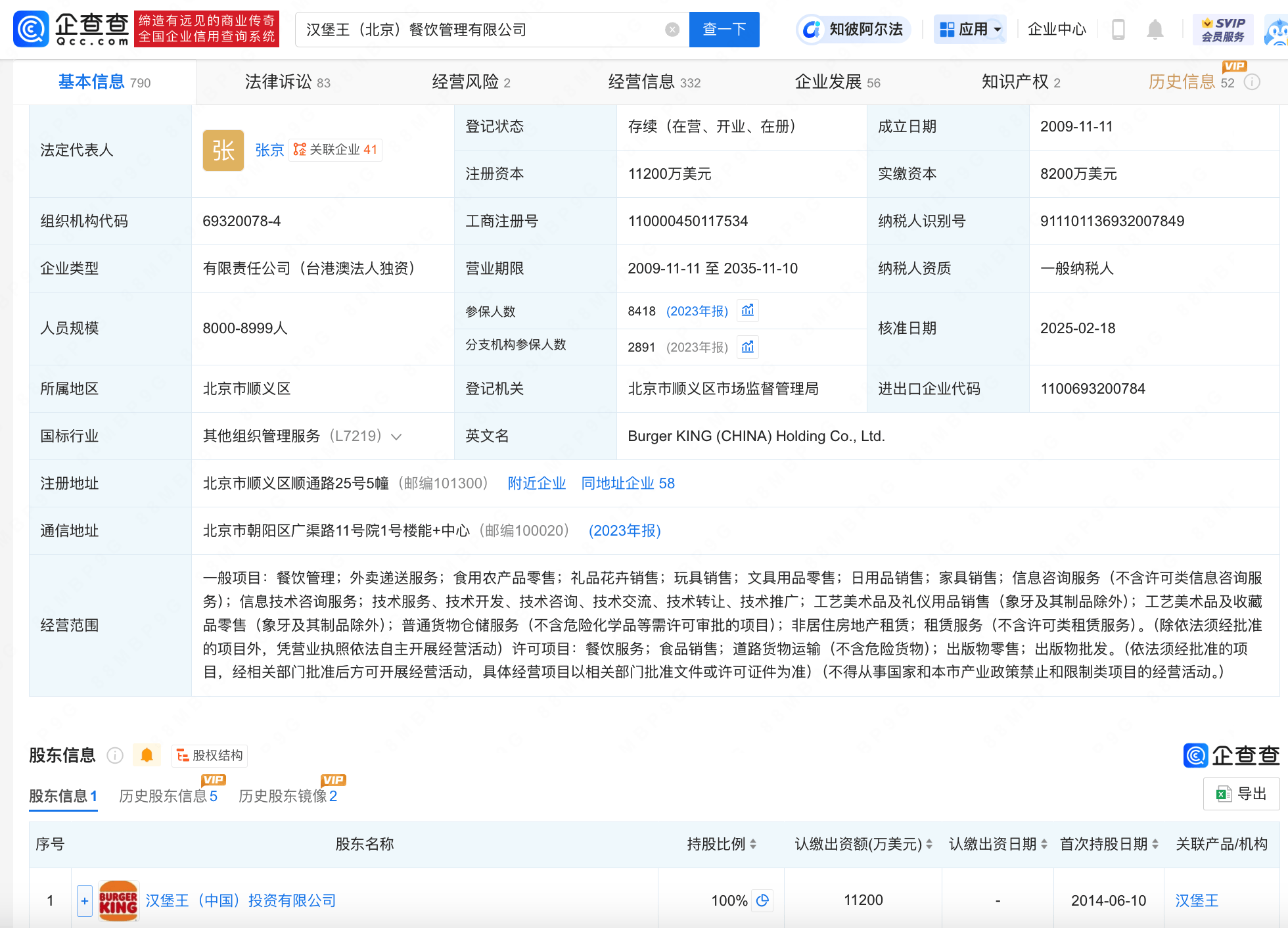 企查查APP显示,近日,汉堡王(北京)餐饮管理有限公司发生工商变更,注册资本由8200万美元增至1.12亿美元。该公司成立于2009年11月,法定代表人为张京,企查查股权穿透显示,该公司由汉堡王(中国)投资有限公司全资持股。
