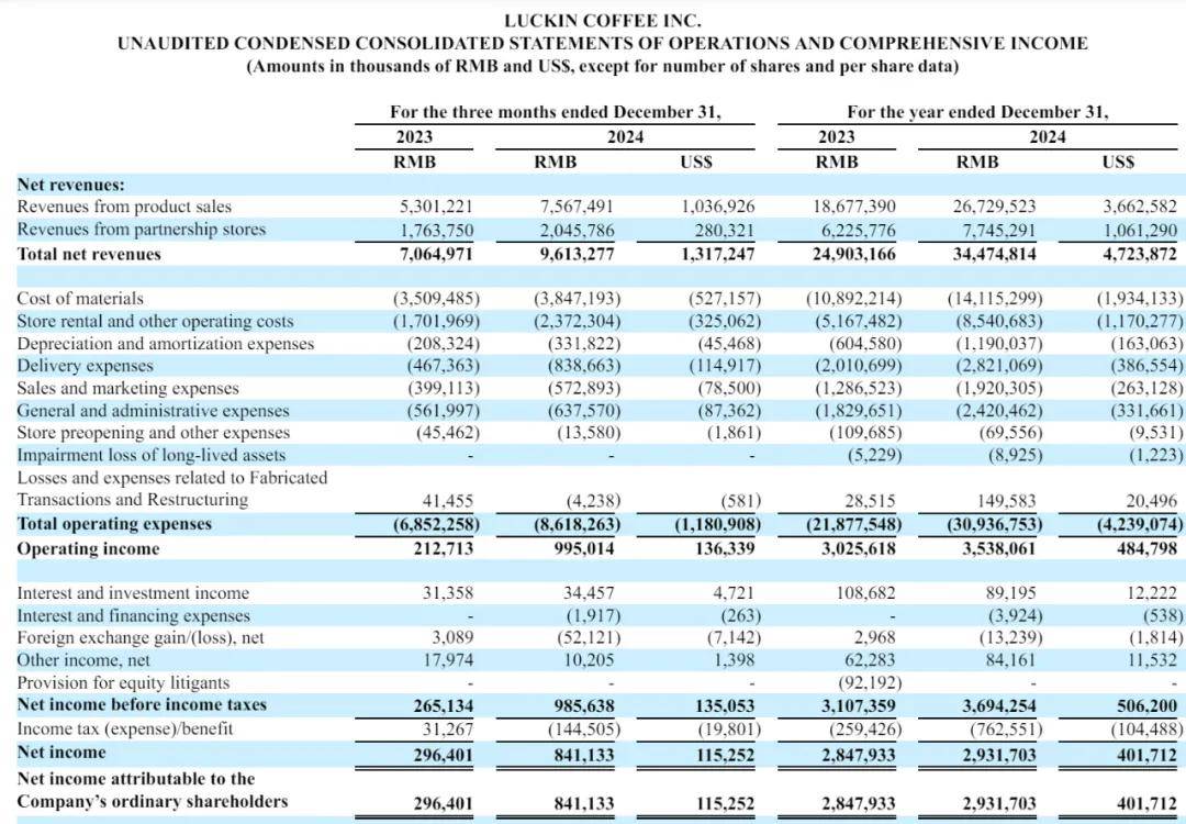 瑞幸咖啡2024财报亮点:年营收增38%,门店破2万,净利大涨市值超90亿
