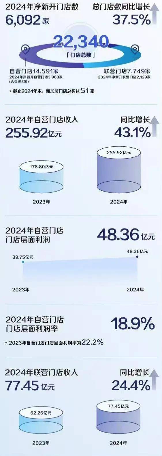 从营收结构来看,瑞幸咖啡的自营门店贡献了255.92亿元的收入,同比增长43%;门店层面利润也达到了48.36亿元,相比上一年度的39.75亿元有了显著提升。联营门店的收入同样表现不俗,达到了77.45亿元,同比增长24.4%。