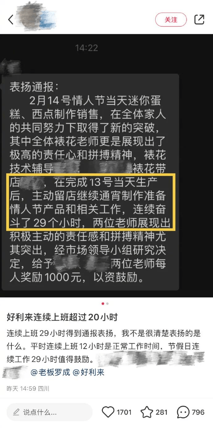 近日,社交媒体上流传的一组截图引发了公众对好利来员工加班文化的关注。截图显示,好利来四川成都某门店发布了一则通报,表彰两名员工因连续工作29小时而展现出的“拼搏精神”。