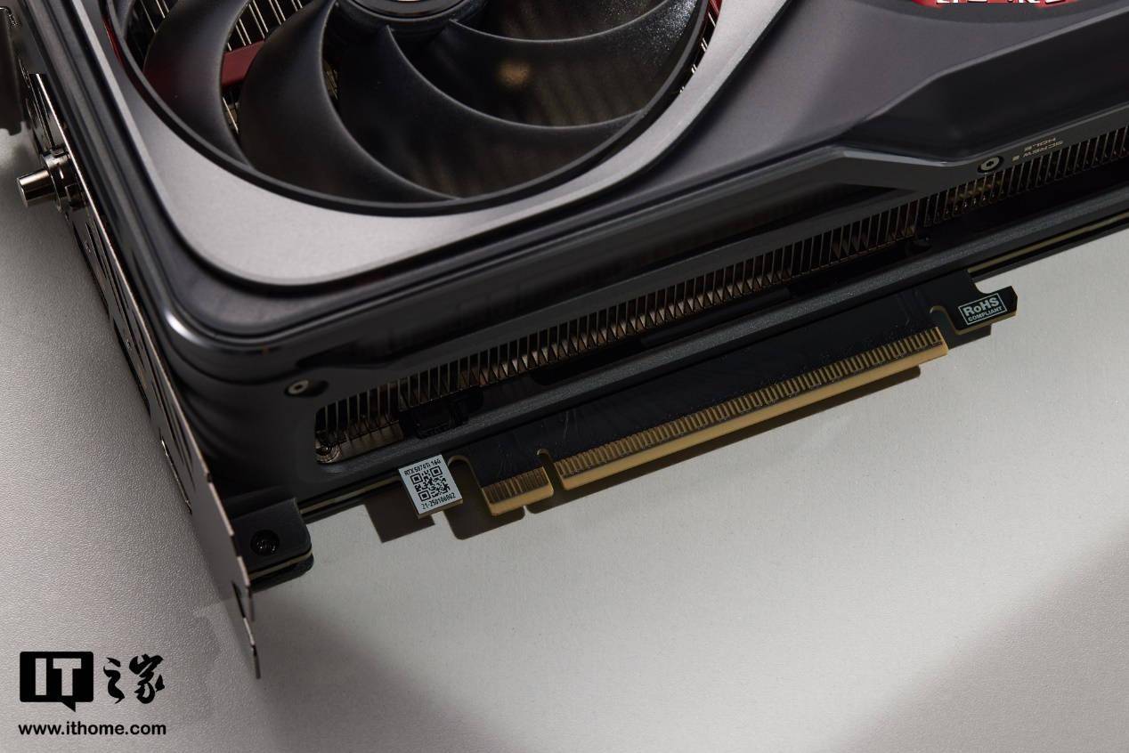 显卡还采用了全新设计的PCIe 5.0规格金手指,具有更好的抗信号干扰性能。供电接口方面,显卡依旧采用了大家熟悉的16pin接口,但与40系显卡不同的是,此次的供电接口采用了倒置设计,并在背板对应位置开槽,使得拔插电源线更加轻松省力。