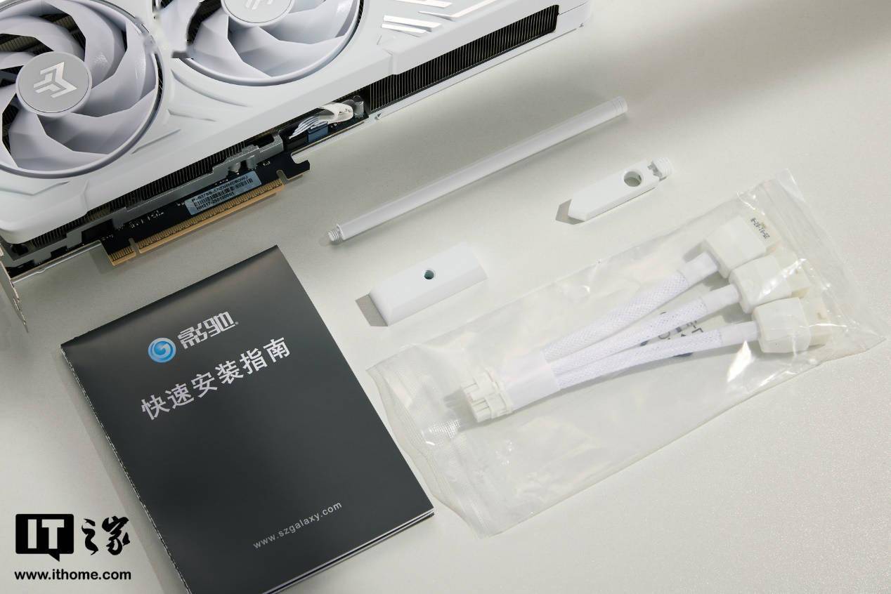 在配件方面,影驰 GeForce RTX 5070 Ti 金属大师白金版 OC显卡也保持了与整体设计一致的白色风格,包括一根12v-2x6转3*8pin的编制线材转接线和一套可拆卸的金属显卡支架。这些配件不仅实用,也进一步提升了显卡的整体质感。