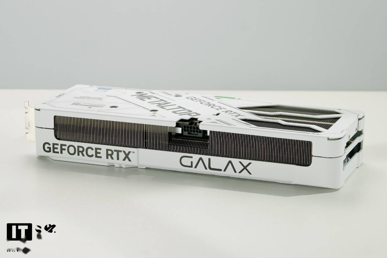 显卡的一侧采用了半包裹设计,金属外壳上印有GEFORCE RTX和GALAX的标志。上方露出内部密集的散热鳍片,居中位置是12V-2*6的显卡供电接口,采用反扣式设计和独立背板开槽,便于用户拔插。另一侧则可以看到置于金手指上方的显卡强化支架,金手指采用了全新的PCIe 5.0规格。