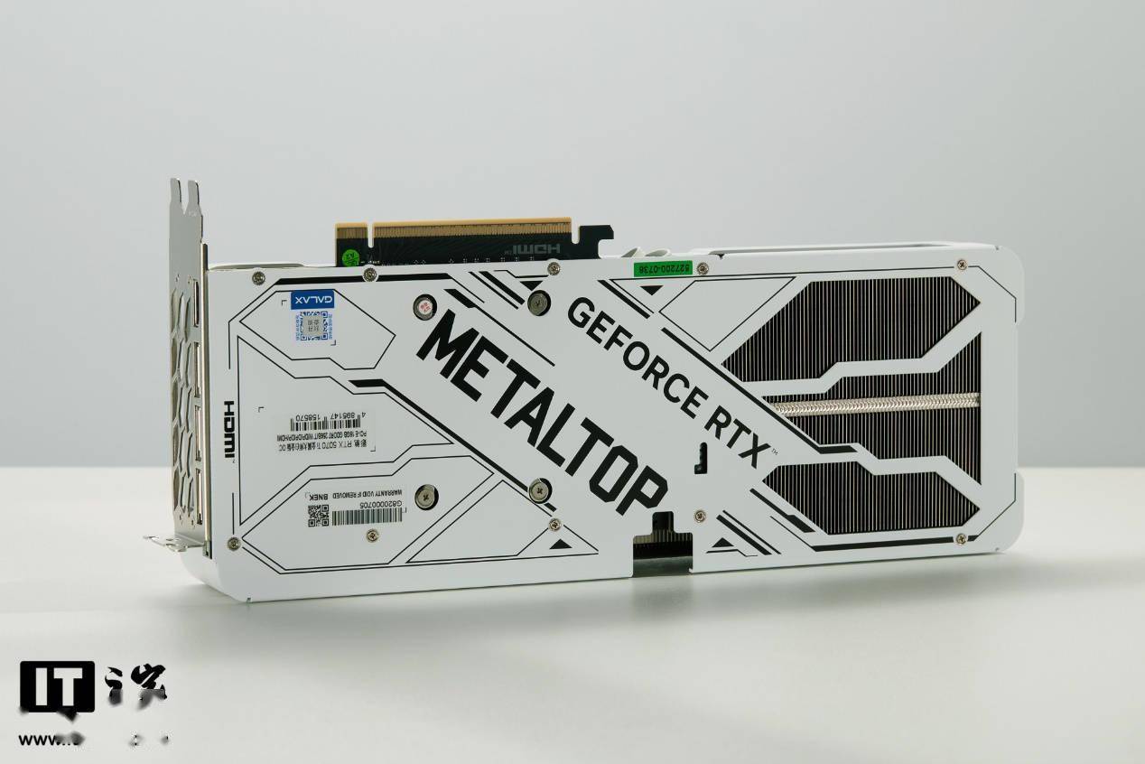 在显卡背板的设计上,影驰 GeForce RTX 5070 Ti 金属大师白金版 OC显卡在中间位置印上了全大写的metaLTOP标志和GEFORCE RTX Logo,凸显了品牌对金属工艺的追求。背板还采用了大面积类似电路板的黑色线条设计,增强了科技感。最左侧特意标出了I/O接口面板对应的HDMI接口位置,方便用户盲插。