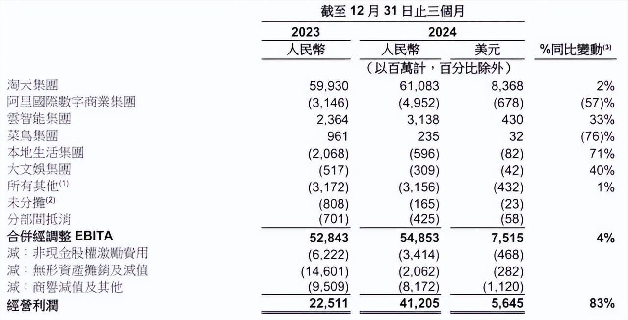 值得注意的是,淘天集团在本季度恢复了增长态势,实现了5%的同比增长。然而,菜鸟集团的表现却略显疲态,对整体业绩产生了一定拖累。
