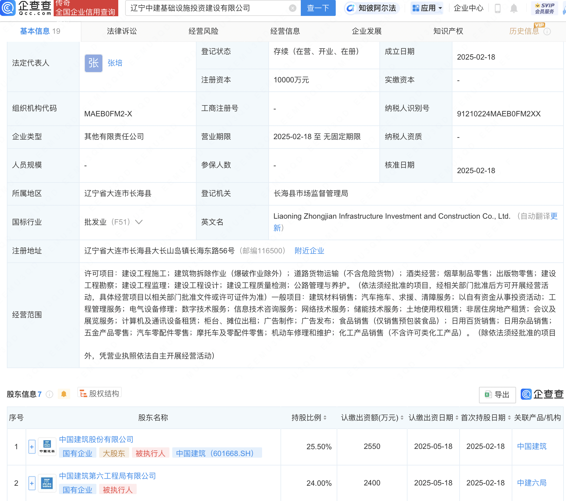 企查查APP显示,近日,辽宁中建基础设施投资建设有限公司成立,法定代表人为张培,注册资本1亿元,经营范围包含:以自有资金从事投资活动;工程管理服务;电气设备修理;数字技术服务等。企查查股权穿透显示,该公司由中国建筑(601668)等共同持股。