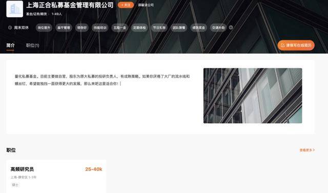 上海正合于2024年底成立,并于今年2月14日正式完成登记。这家私募基金的注册资本为1000万元,且已全额实缴,由葛陈亮全资控股。公司目前有5名全职员工,其中4人已取得基金从业资格。尽管目前管理规模在0至5亿元之间,但上海正合正积极扩大团队,通过猎聘网等渠道招聘高频研究员,提供的月薪范围在2.5万至4万元。