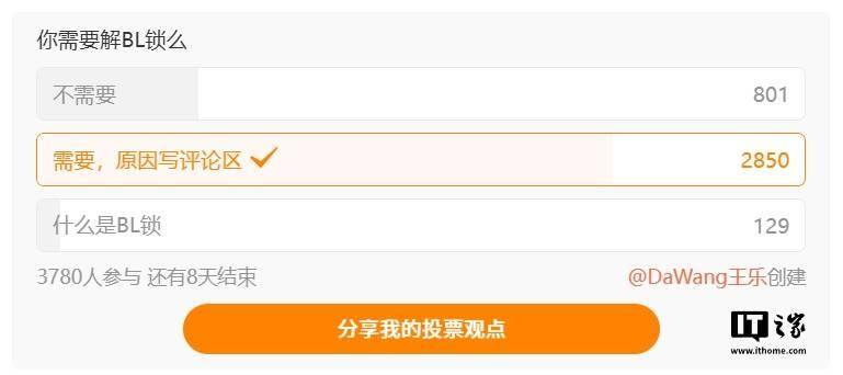 调查结果显示,多数用户对解锁BL锁有需求。具体而言,有2850名用户在评论区表达了他们的解锁需求,并给出了各自的原因;而表示不需要解锁的用户则为801名。还有129名用户对BL锁这一概念表示了不了解。