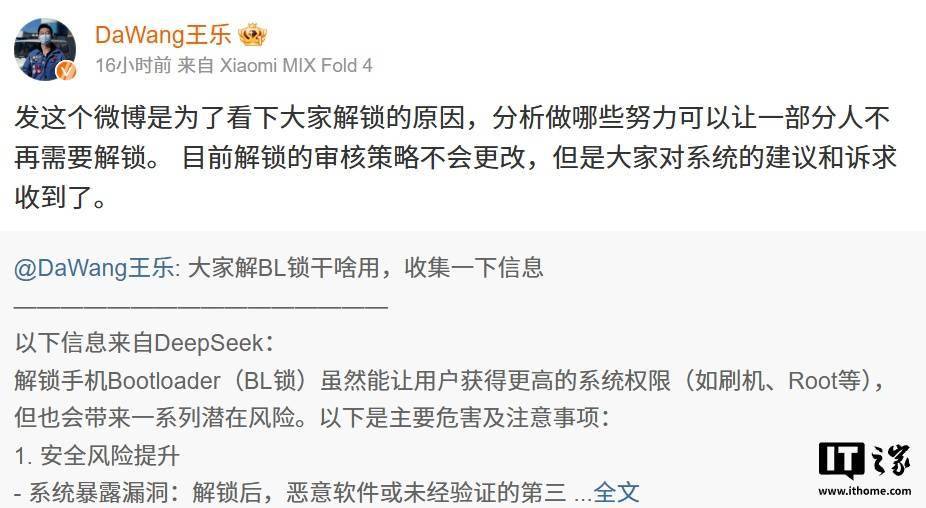 面对用户的热情参与和反馈,王乐在今日凌晨对发起此次调查的原因进行了解释。他表示,此次调查旨在深入了解用户解锁BL锁的具体原因,以便小米公司能够分析并采取措施,减少一部分用户的解锁需求。