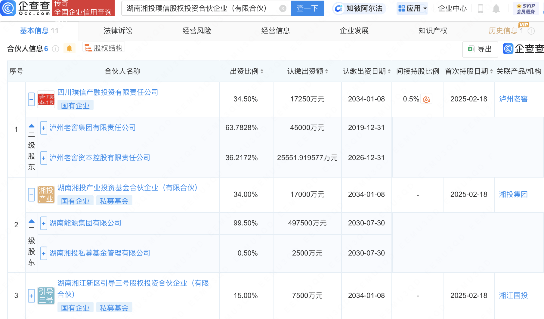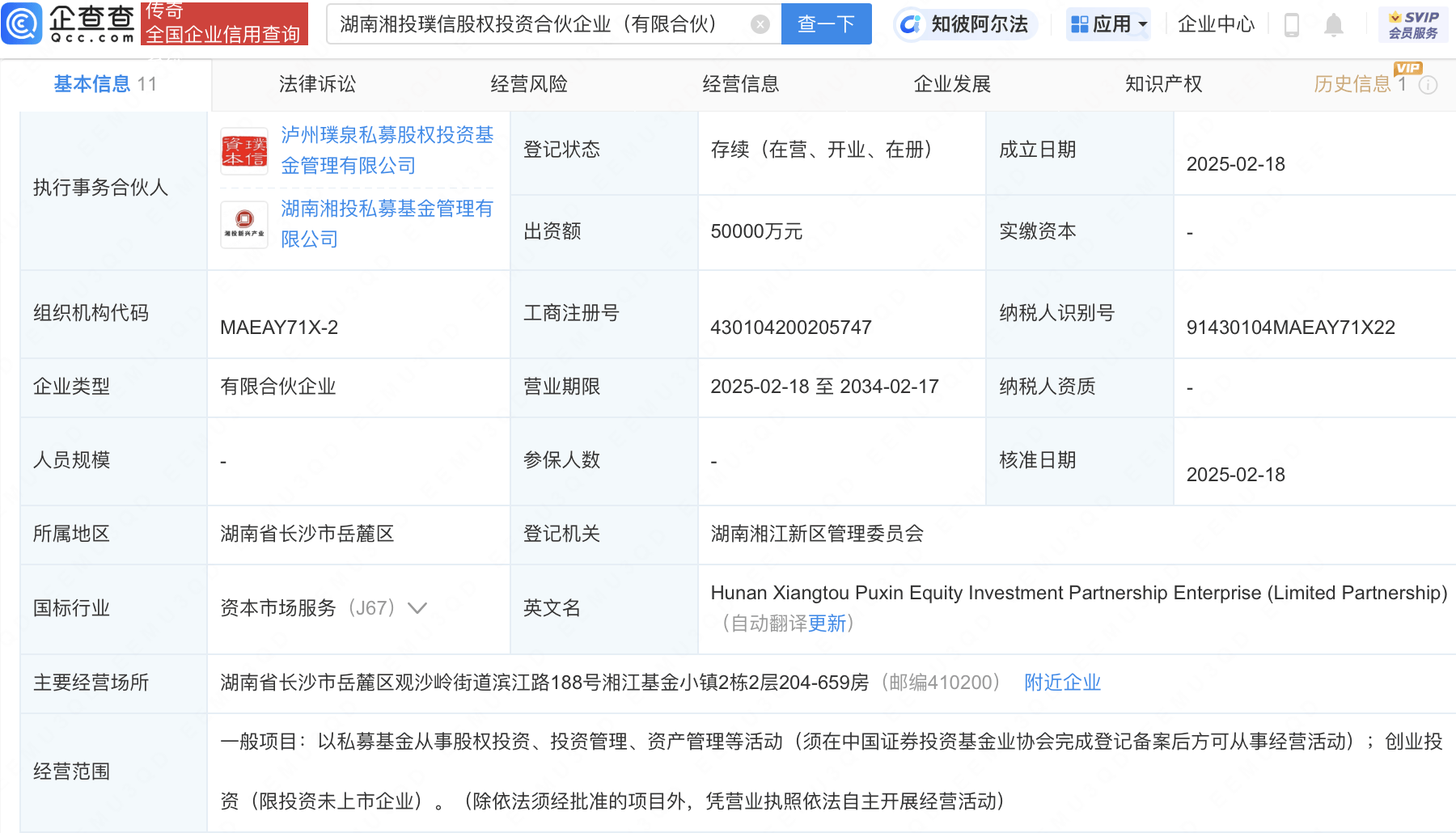 企查查APP显示,近日,湖南湘投璞信股权投资合伙企业(有限合伙)成立,出资额5亿人民币,经营范围为以私募基金从事股权投资、投资管理、资产管理等活动。企查查股权穿透显示,该企业由泸州老窖集团旗下四川璞信产融投资有限责任公司、湖南能源集团旗下湖南湘投产业投资基金合伙企业(有限合伙)等共同出资。