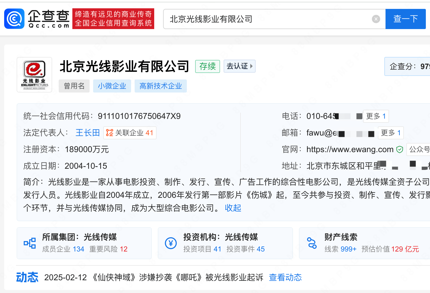 北京光线影业有限公司成立于2004年10月,由知名传媒人王长田担任法定代表人。公司注册资本高达18.9亿人民币,且由北京光线传媒股份有限公司全资控股。经过多年的发展,光线影业已成为国内影视行业的佼佼者,其出品的影视作品多次在市场上取得佳绩。
