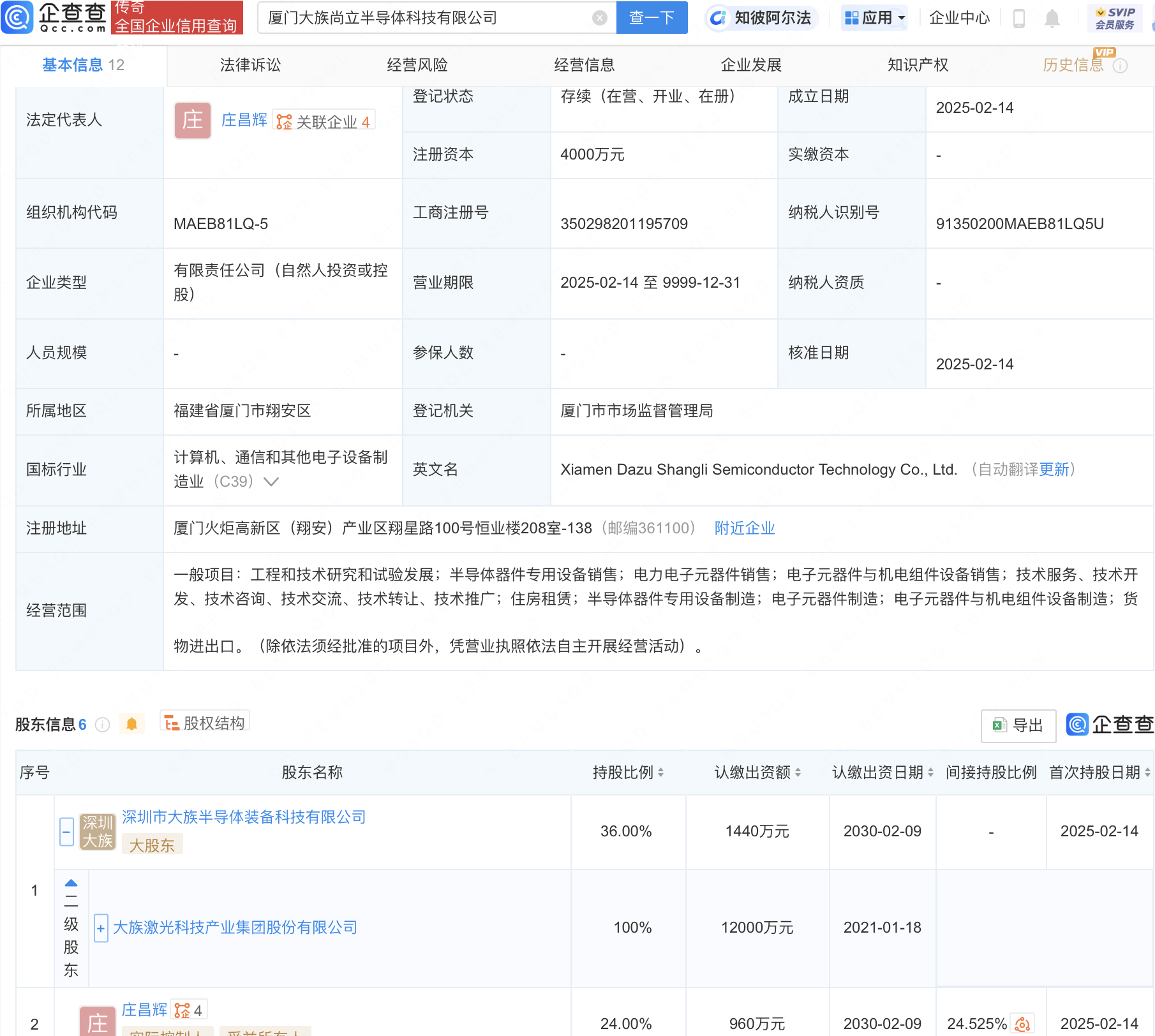 据企查查APP披露的信息,厦门大族尚立半导体科技有限公司的股权结构引人注目,其背后有着大族激光(股票代码:002008)旗下深圳市大族半导体装备科技有限公司等企业的共同持股。这一背景无疑为该公司的未来发展增添了厚重的底蕴。