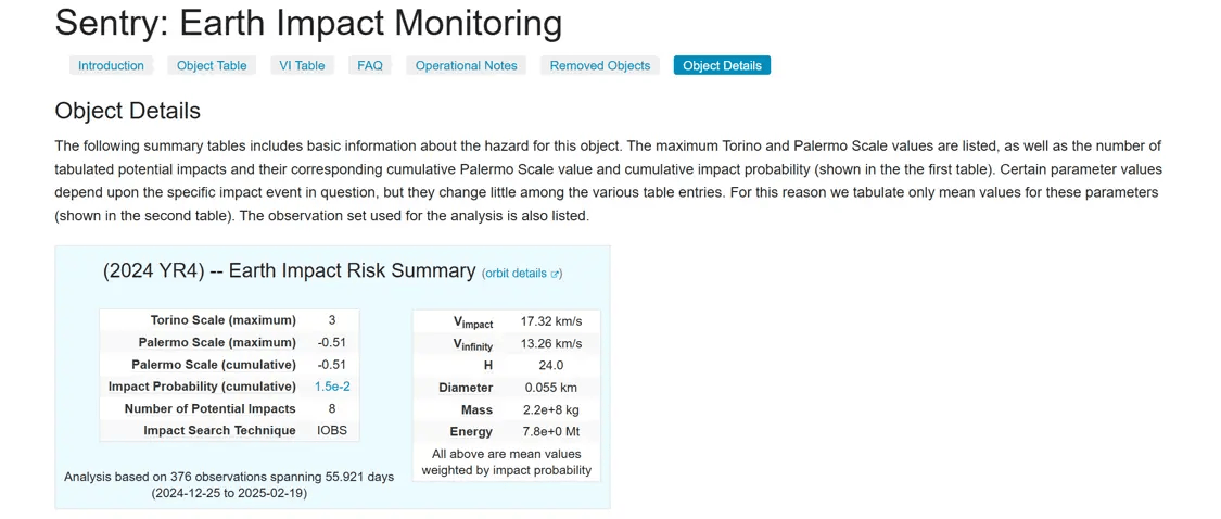 据NASA最新发布的数据,小行星2024 YR4撞击地球的概率已经从先前的3.1%显著下调至1.5%。而在此之前,这一概率的上升曾引发广泛关注,一度被认为是现代预测史上最具威胁性的小行星之一。