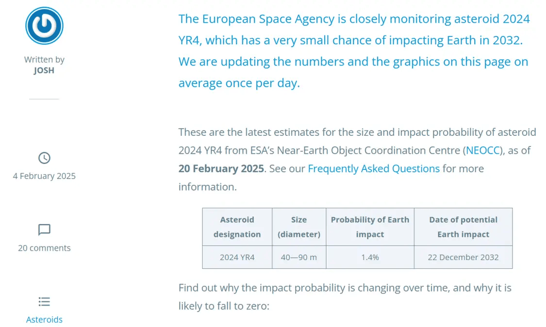 小行星2024 YR4撞地风险骤降,NASA与ESA最新数据引关注