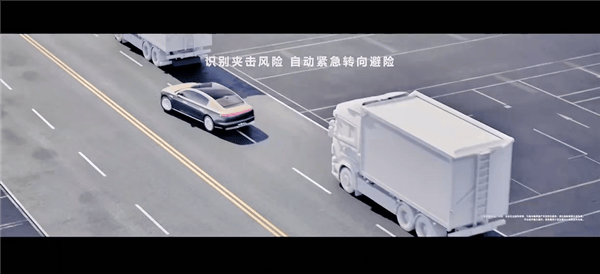 在现实生活中,很多恶性交通事故都是由“夹心状”碰撞引起的,即车辆被两台大型货车夹击。而尊界S800则能够通过全车感知硬件与系统的智能配合,有效识别这种夹击风险,并自动进行紧急转向操作,从而规避潜在的危险。