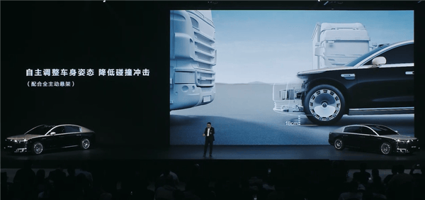 尊界S800还配备了全主动悬架系统,能够根据路况自主调整车身姿态。例如,在面临碰撞风险时,系统可以提高车头高度,使车舱缓冲区域发挥最大效用,显著降低“钻入”风险,为乘客提供全方位的保护。