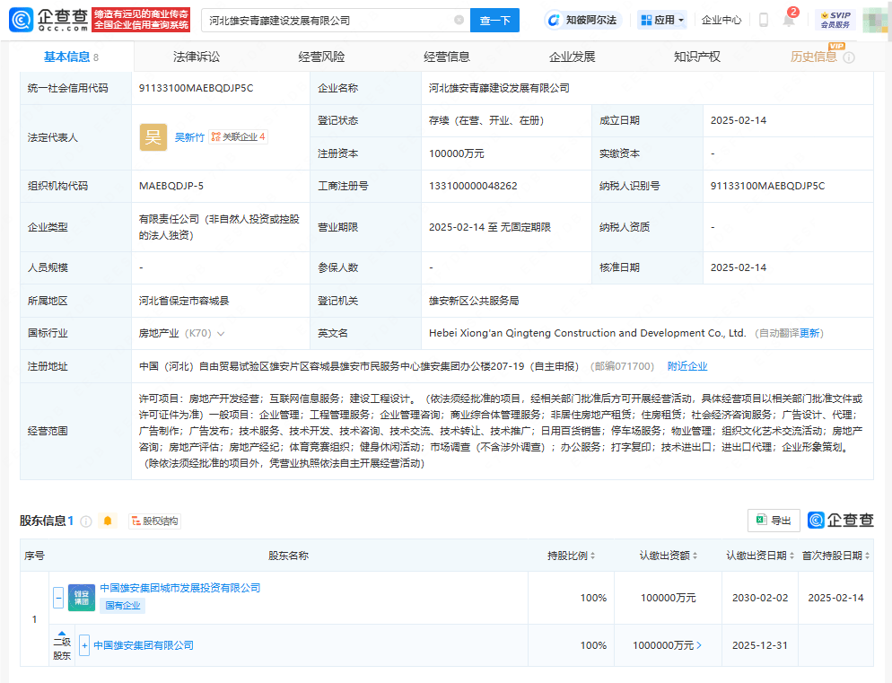 企查查APP显示,近日,河北雄安青藤建设发展有限公司成立,法定代表人为吴新竹,注册资本10亿元人民币,经营范围涉及房地产开发经营、互联网信息服务、建设工程设计、商业综合体管理服务、组织文化艺术交流活动、健身休闲活动等。企查查股权穿透显示,该公司由中国雄安集团有限公司间接全资持股。