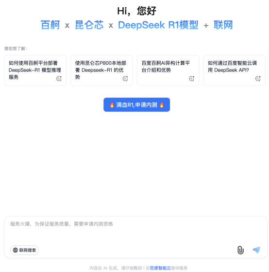 春节期间,DeepSeek凭借其卓越的技术性能和创新功能,迅速在市场中崭露头角,实现了C端用户数量的爆发式增长。然而,当考虑将其应用于企业业务时,除了模型本身强大的性能之外,稳定性和安全性也是关键因素。为此,百度百舸基于昆仑芯P800,发布部署 “满血版DeepSeek R1+联网搜索” 服务。通过联网搜索功能,将最新的互联网数据融入答案生成,为企业提供更及时、准确的信息支持,让企业业务不再等待,高效运转成为常态。现在,企业用户及开发者朋友们可以通过访问aihc.baidu.com申请体验测试资格。