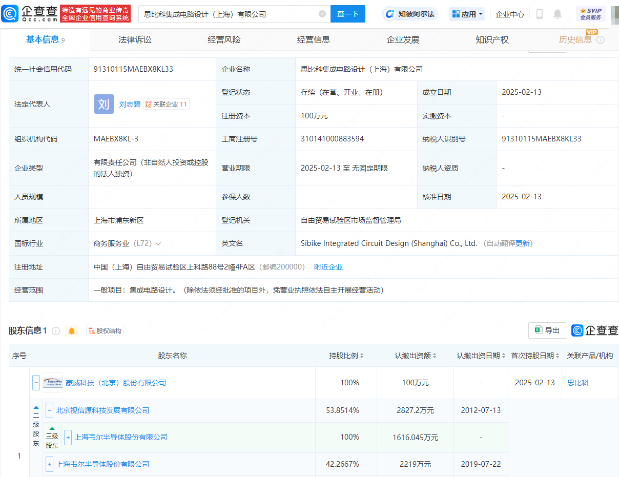 企查查APP显示,近日,思比科集成电路设计(上海)有限公司成立,法定代表人为刘志碧,注册资本为100万元,经营范围包含:集成电路设计。企查查股权穿透显示,该公司由韦尔股份(603501)旗下豪威科技(北京)股份有限公司全资持股。