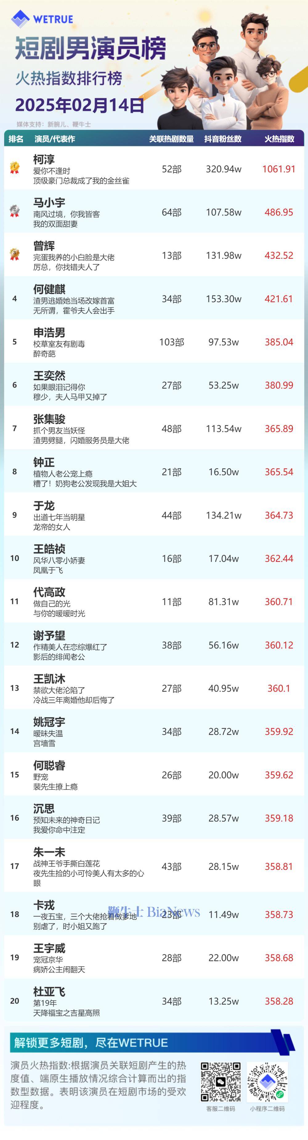 2月14日短剧演员火热指数揭晓:余茵、柯淳登顶冠军宝座