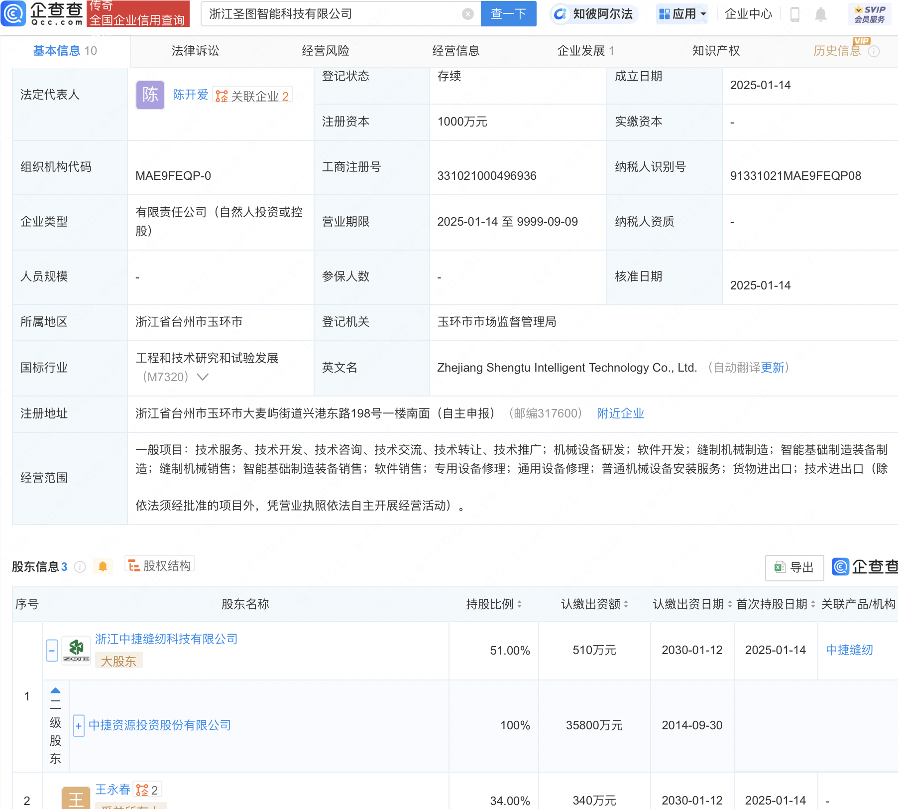 企查查APP显示,近日,浙江圣图智能科技有限公司成立,法定代表人为陈开爱,注册资本1000万元,经营范围包含:通用设备修理;普通机械设备安装服务;货物进出口;技术进出口等。企查查股权穿透显示,该公司由中捷资源(002021)旗下浙江中捷缝纫科技有限公司等共同持股。
