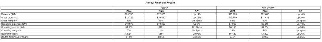 在非通用会计准则(Non-GAAP)下,AMD的财务表现同样亮眼。2024年,公司的Non-GAAP运营利润为61.38亿美元,同比增长26%,运营利润率也达到了24%,较上年提升了3个百分点。Non-GAAP下的净利润为54.2亿美元,同比增长26%。