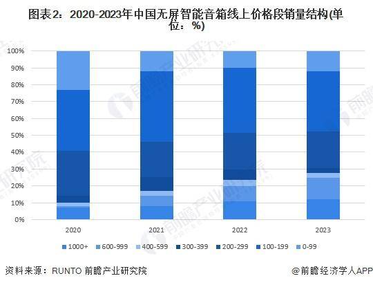 从线上价格段销量结构来看,中国无屏智能音箱市场正逐渐摆脱低价竞争的格局。近年来,千元以上和600-999元价格段产品的市场占比持续增长,反映出消费者对高品质和功能更丰富的智能音箱产品的需求不断增加。与此同时,0-99元的低价产品占比显著下降,进一步证明了市场向高端化发展的趋势。