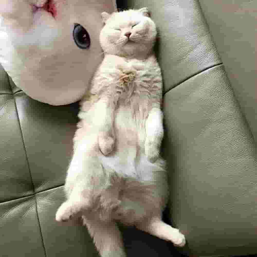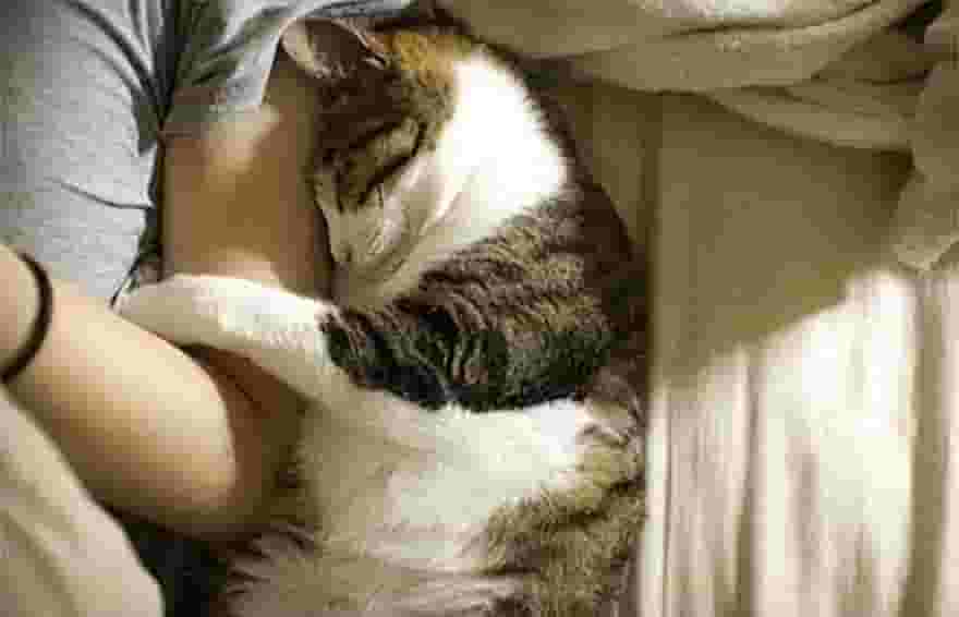 猫咪睡觉的时候,其实很缺乏安全感, 很少会挨着人睡,而当猫咪对你十分信任后,它就会挨着你睡,而且睡得十分放心。
