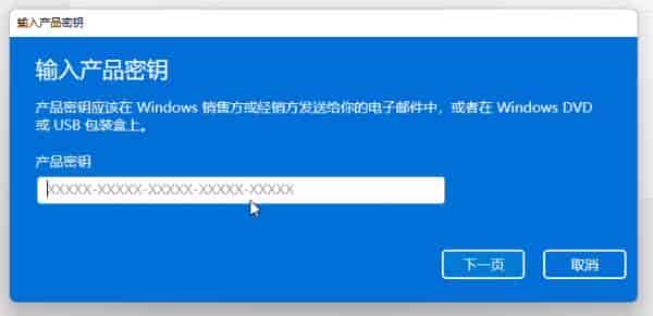 4、接着会打开输入产品密钥界面,输入我们的密钥,并点击“下一页”