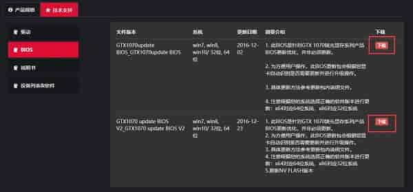 4、接着在技术支持中进入“bios”选项,在其中点击“下载”到与自己主板符合的bios升级文件。