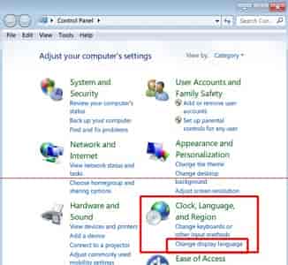 2、找到“Clock,Language,and Region”下的“Change dispaly language”