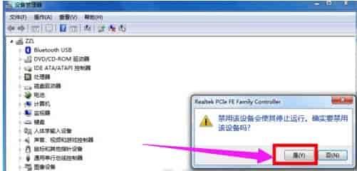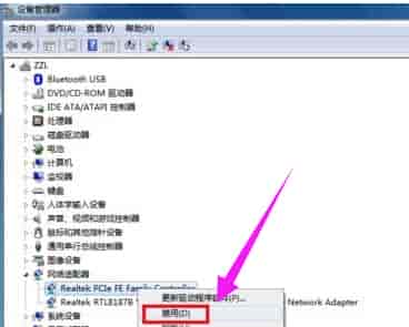 3、在设备管理器页面找到“网络适配器”下面一般有两个网卡,一个有线一个无线网卡!点击有线网卡右键--禁用。