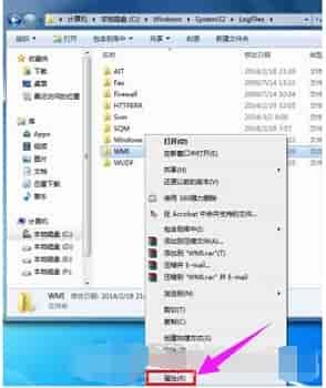 2、在LOgFiles文件夹下找到WMI文件夹,然后选中点击右键--属性,如下图所示!其实就是让它获得永久管理员权限!我的方法可以不用每次重启电脑后都要修改一次权限。