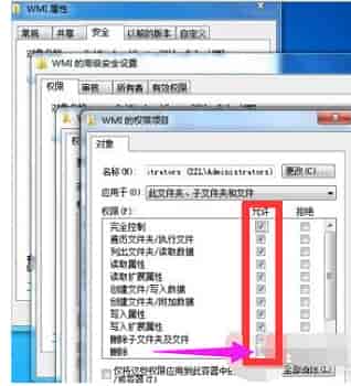 6、在进入你的账号对WMI文件夹控制选项中,将完全控制下方的所有选项全部勾选,然后点击确定按钮。