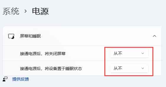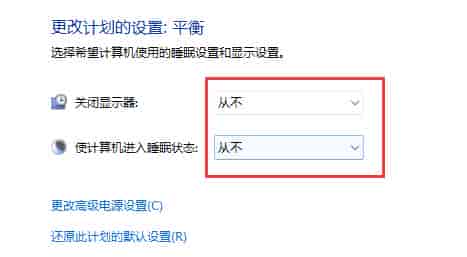 3、然后将其中屏幕和睡眠全部改为“从不”就可以解决了。